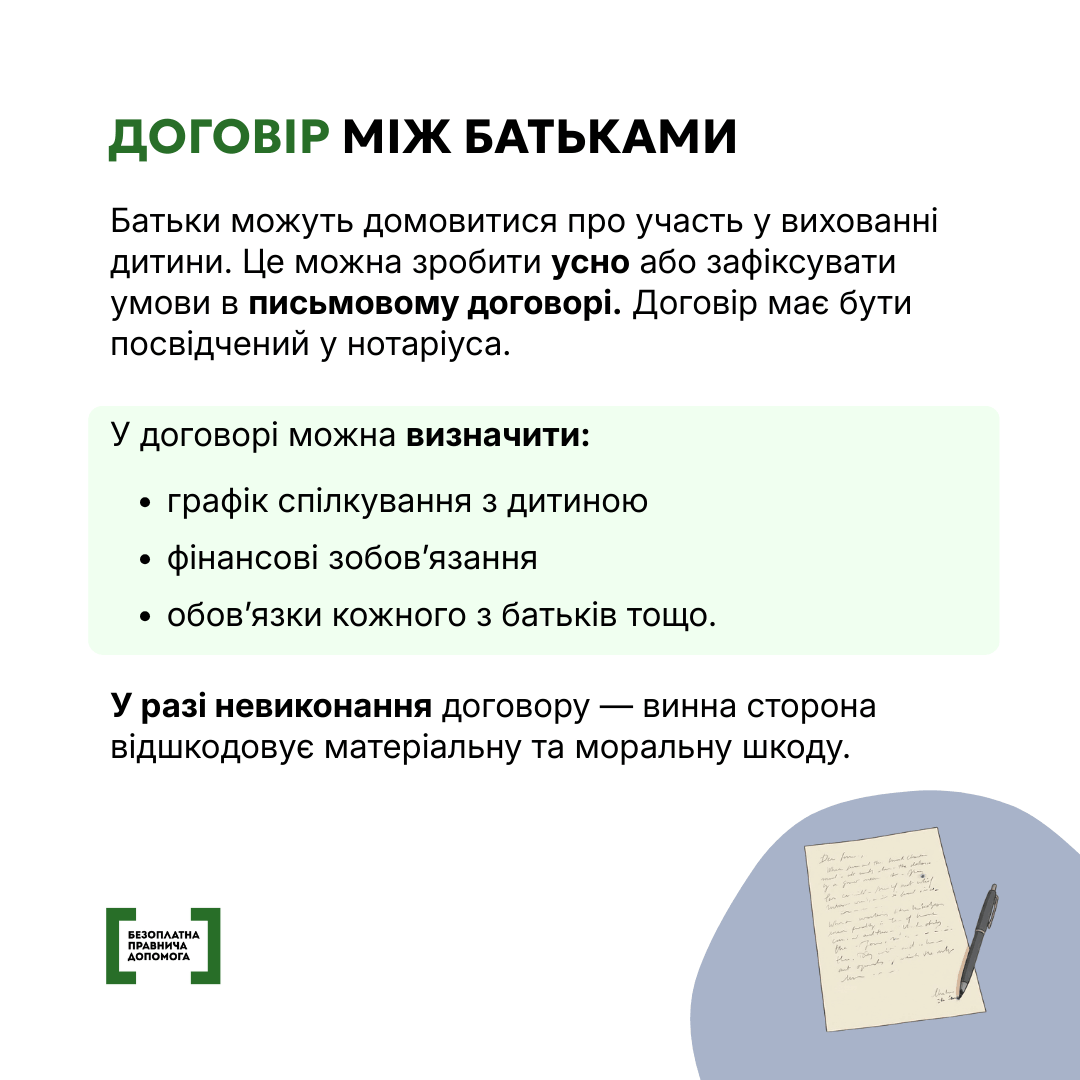 Мати та батько мають однакові права та обов’язки щодо дитини, незалежно від того, чи були вони у шлюбі, чи ні. Розлучення або окреме проживання — не скасовує батьківських прав. Дитина залишається спільною, а виховання — спільним обов’язком.